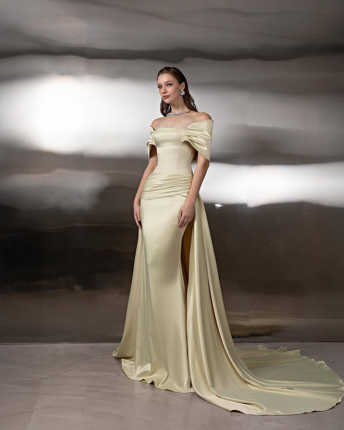 The off-shoulder neckline is elevated by sculptural folded sleeves that frame the shoulders with precision, creating a poised and commanding silhouette. A smoothly contoured bodice defines the waist, while subtle ruching adds dimension without disrupting the gown’s clean, elongated lines.