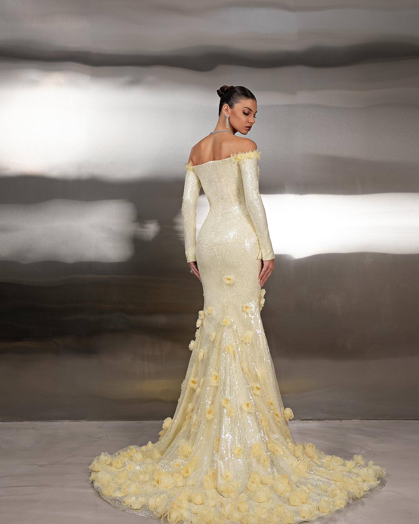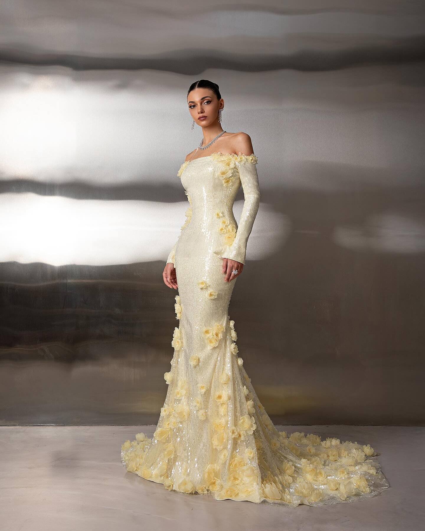 Long sleeves balance romance with structure, while the gentle flare at the hem transitions into a delicate train adorned with layered floral accents. The result is a harmonious blend of strength and softness—luxurious without excess, romantic without fragility.