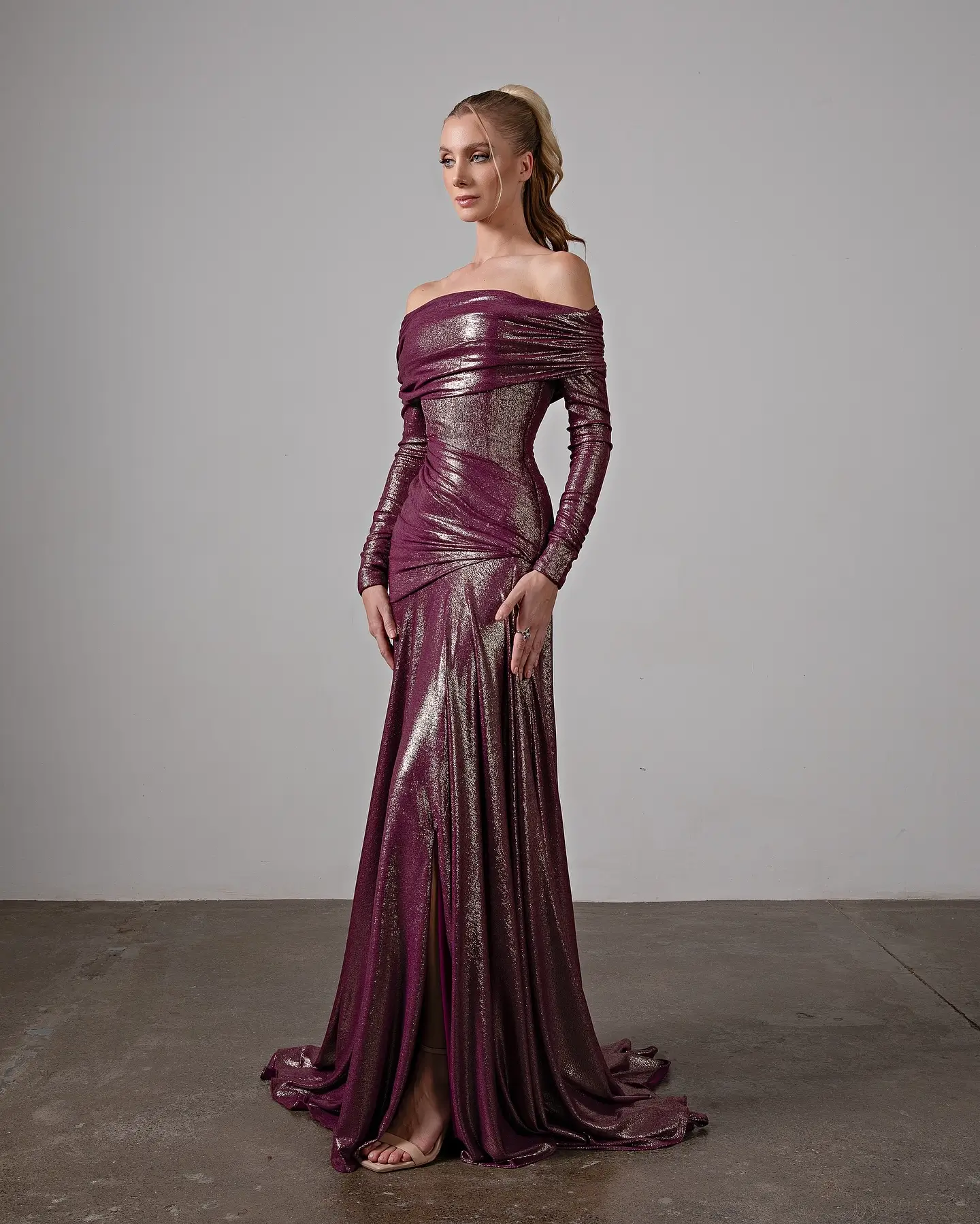 The off-shoulder neckline gracefully frames the shoulders and collarbones, while the fitted long sleeves balance sensuality with refinement. Soft draping across the bodice and hips sculpts the figure, creating a fluid, elongated silhouette that moves effortlessly with the wearer.