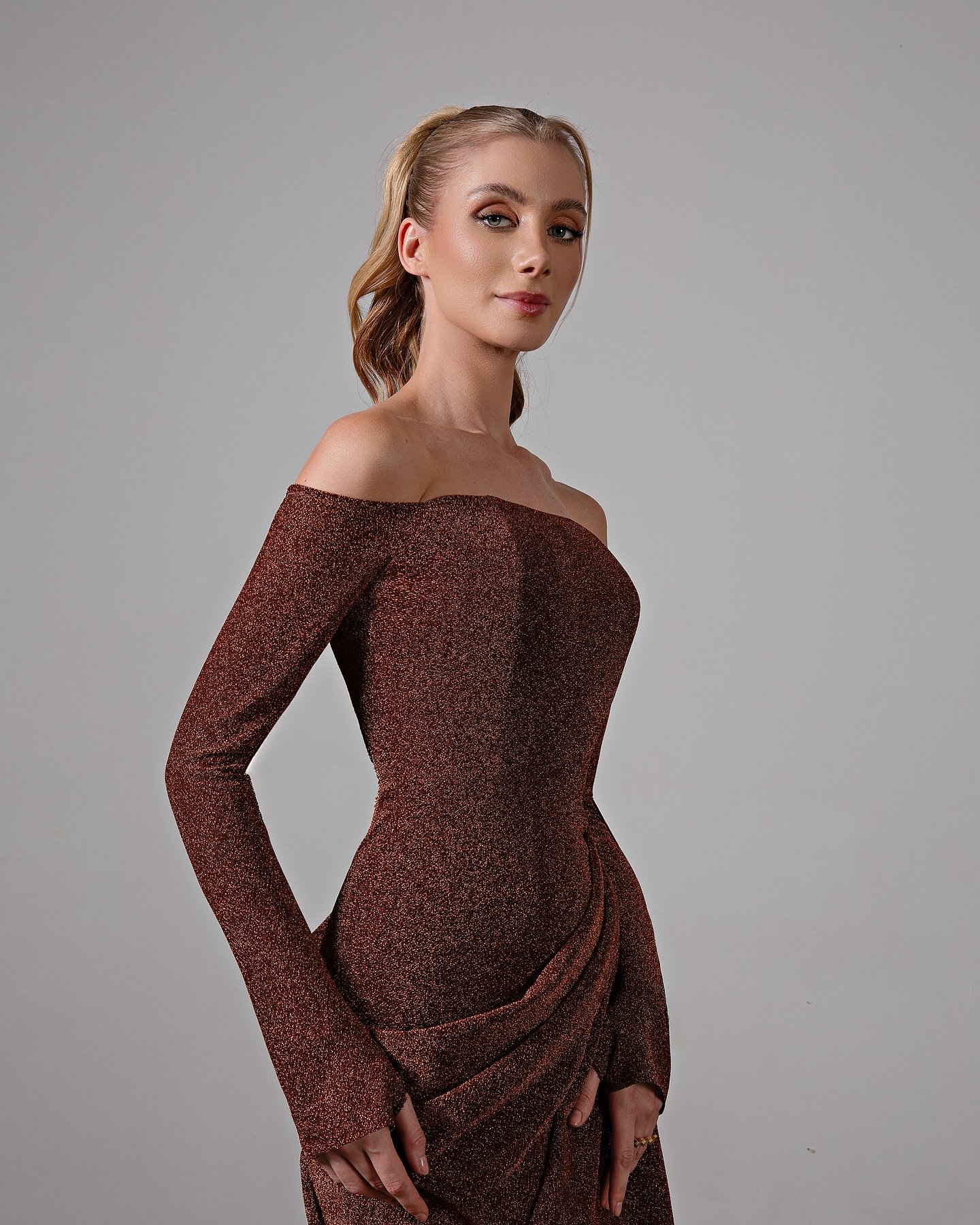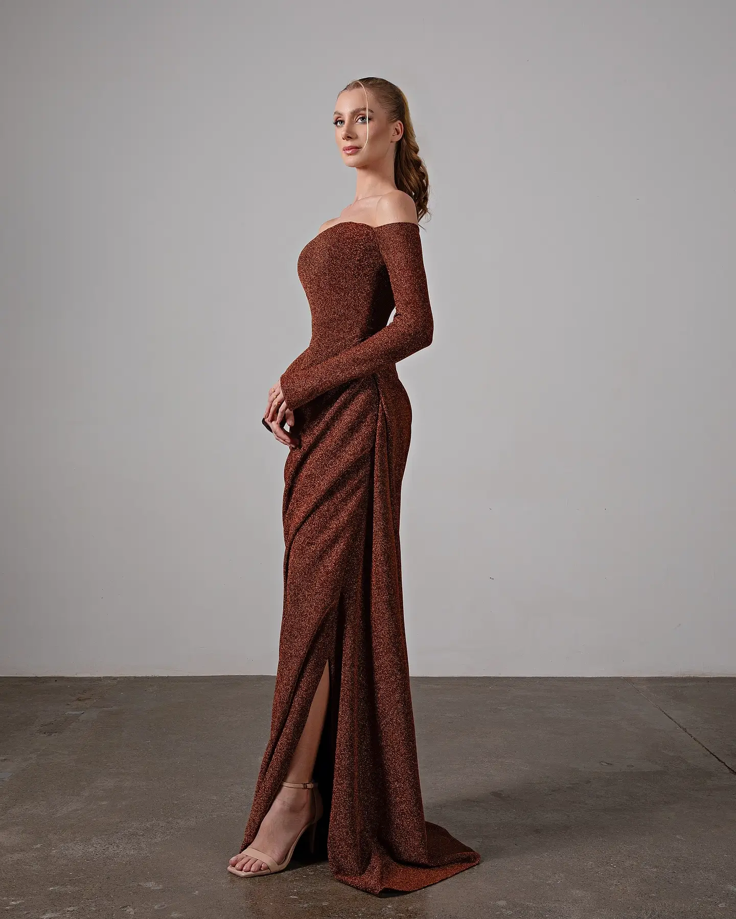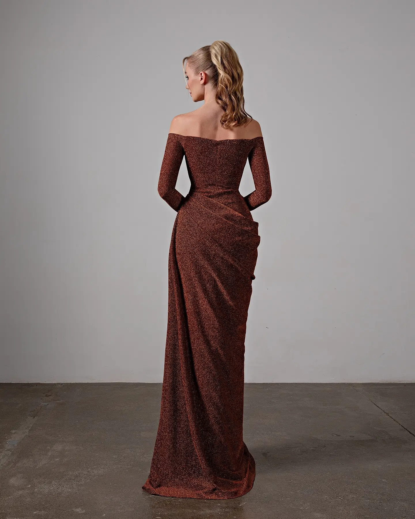 A sculpted off-shoulder evening gown in burnished copper tones, designed with a sleek silhouette, long sleeves, and elegant draping for a powerful, refined statement.